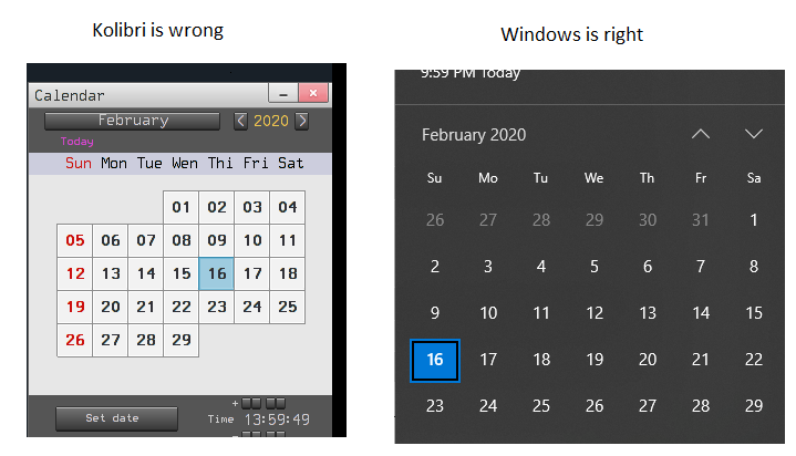 Steps To Reproduce | Open Calendar, it shows Feb 2020 starting on Wed (which is wrong, it starts on Sat). If you click Today (or otherwise refresh, eg using Ctrl+F2) it's correct. | ||||