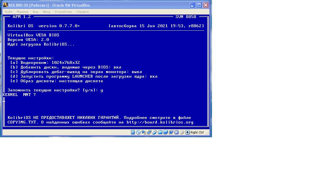 | Description | Перед загрузкой Колибри ОС выводится информация о текущих настройках. Если нажать кл. "b", то выводится текст с вопросом, на которое жму кл. "1". Далее, для продолжения загрузки жму кл. "Enter". Появляется текст с вопросом: "Запомнить текущие настройки?". Если я нажму кл. "y", то появляется надпись "KERNEL MNT?" и больше ничего не происходит (только мигает курсор ввода). Прилагается скриншот. | ||||